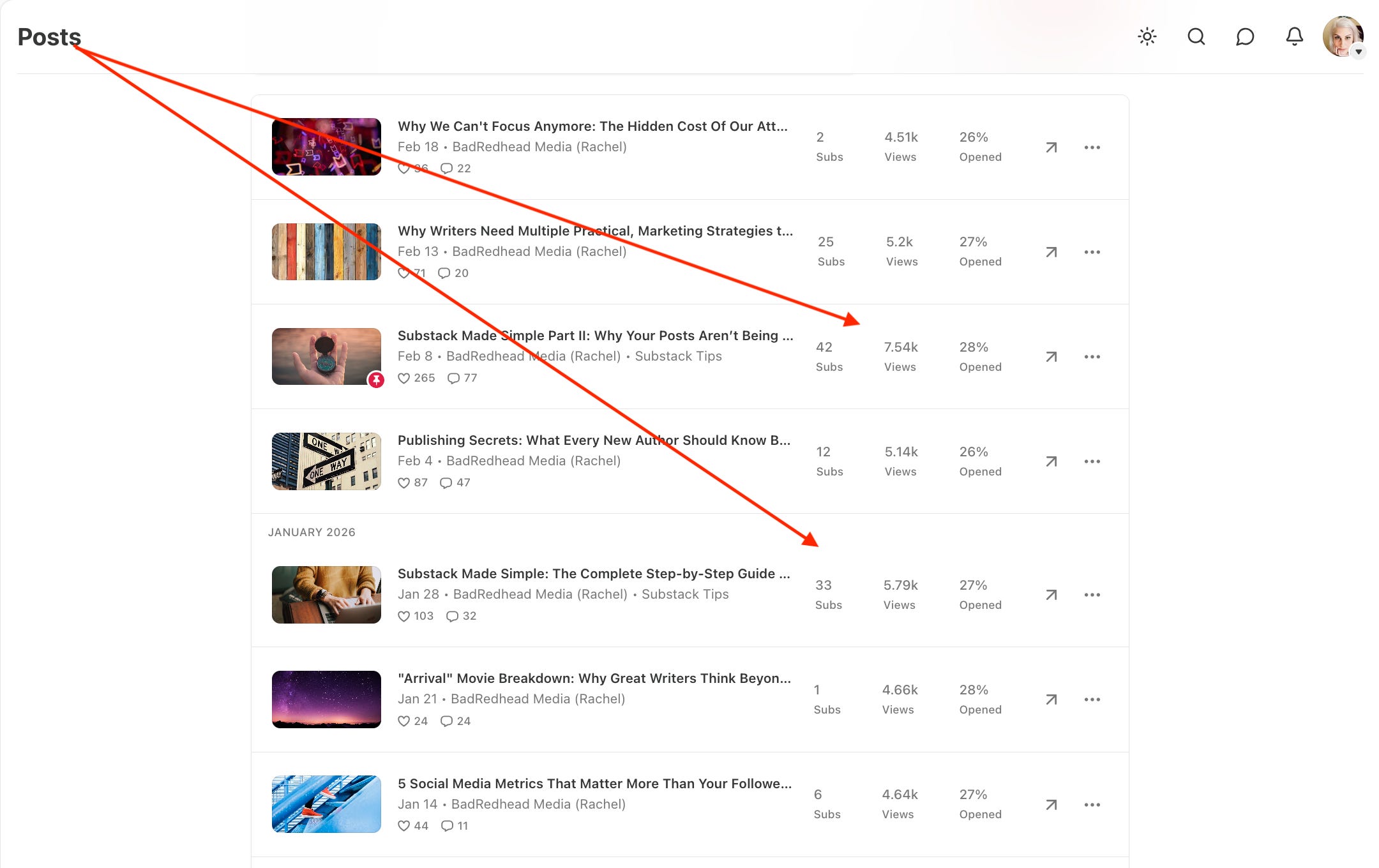 How to check: If you click on Posts on the left side of your publication dashboard, you will see analytics.
